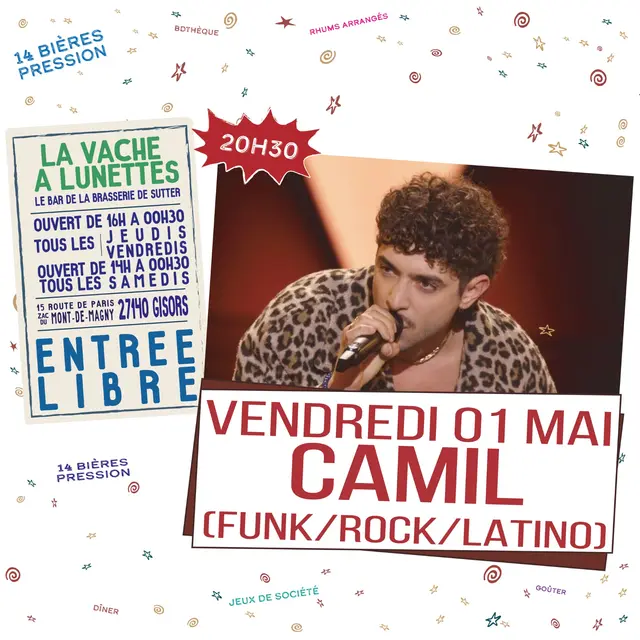 Funk/rock/latino Camil est un jeune artiste locale, actuellement candidat sur la saison 15 de The Voice France. Il nous propose une soirée bien dansante avec son band et ses propres compositions funk, rock et latino.
